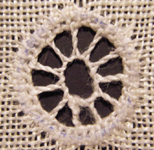 Hedebo Cut Work developed around the year 1850. Holes were cut in the fabric and they did not follow the warp or weave. The holes were filled with needlelace and were the essence of the motif. In Reverse Hedebo Cut Work, motives were cut out of linen fabric and the small pieces of fabric were then linked with needlelace and “Hedebo Rings”.