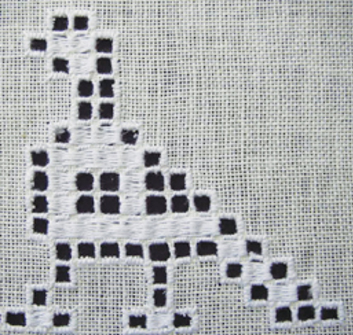 A new variety of Hedebo Embroidery appeared during the first decade of the 1800’s. It was named Square Cut work. Threads of the fabric were cut within small squares and when grouped together, they produced open figures depicting animals, people and trees. In this technique, small squares shape the motif as opposed to Drawn Thread Work, where the filling of the squared network forms the motif.