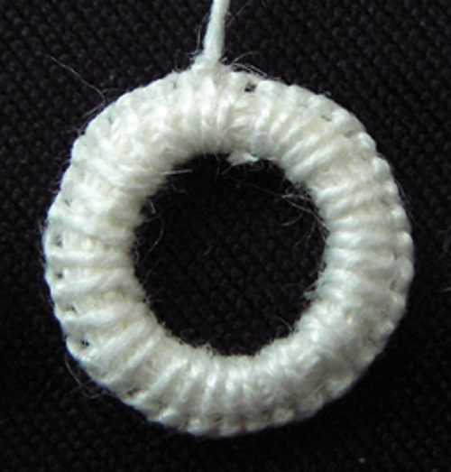 This guide with drawing and text shows how to sew a Hedebo ring around a Hedebo stick. The Hedebo ring can, for example, be sewn for a button.
