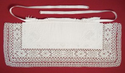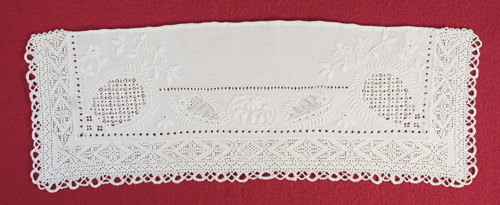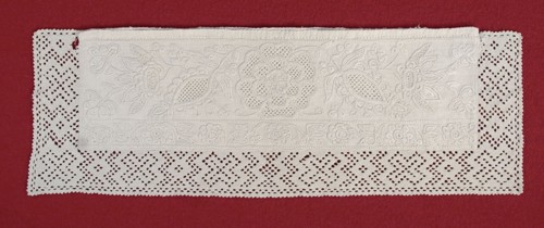 The collar was unpicked from a shift. The ”Hvidsøm” embroidery is divided into two parallel borders with a narrow chain of hemstitch in between. In this piece, fillings in the outermost flowers are sewn on the fabric, instead of being in the drawn fabric. All other fillings are made by drawing threads and embroidering cross-stitching over the remaining threads. In the lower narrow border, the flowers are embroidered in satin stitch, outline stitch, and chain stitch without fillings. The Hedebo edge is very tight and firm. It is embroidered with Danish buttonhole stitching in long rows with squared holes, which form the pattern. The collar is a typical example of a collar from around 1815 embroidered by an experienced needlewoman.
