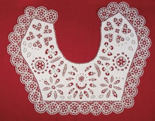 - The row of tilted scallops along the inner side of the collar, which indicates that the lace was embroidered as a single unit, and attached later to the collar