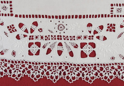 - That the square spaces in the narrow border are filled with a cross bar of threads which is repeated in the solid part of the lace
