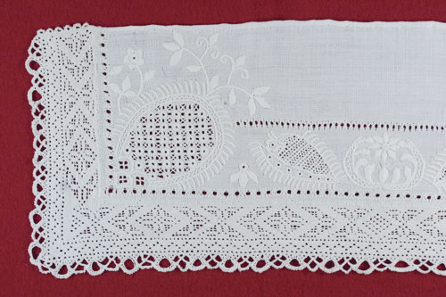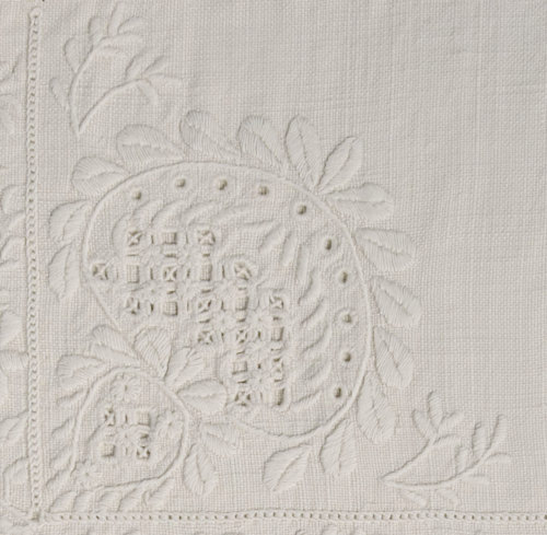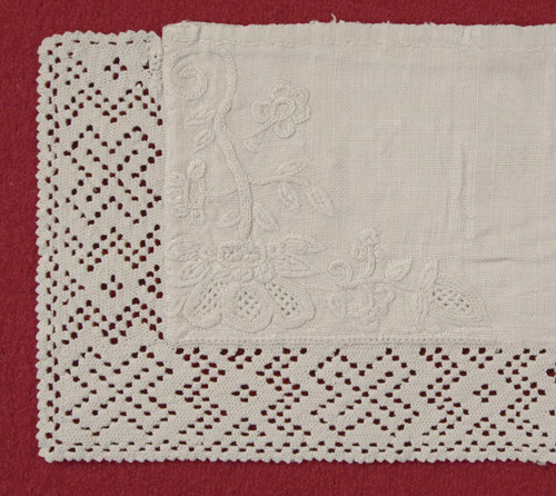 - The corner motif in ”Hvidsøm” on the reverse side has additional chain hemstitch, just enough to cover the width of the corner embroidery