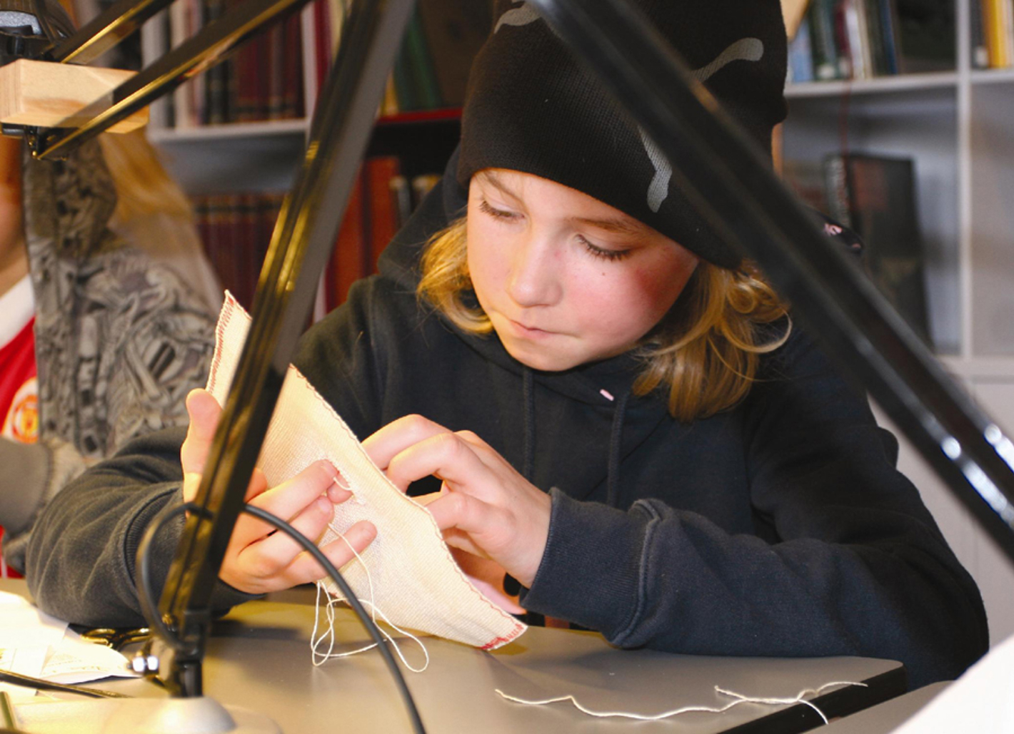 Greve Museum ønsker at opmuntre nye generationer til at lære at sy hedebosyninger. Her ses en af de skoleelever, som deltager i museets udvikling af et nutidigt undervisningsmateriale og -program, som del af deres håndarbejdsfag.